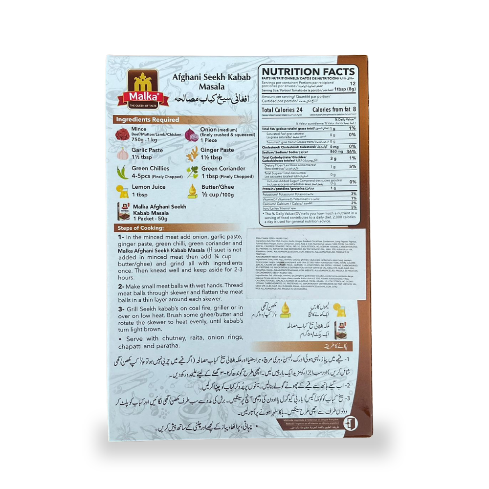 Mixul de condimente este ideal pentru gătit pe grătar sau într-o tigaie, fiind ușor de utilizat și potrivit pentru preparate rapide sau mese speciale. Condimentul Kebab Afghani Seekh Malka aduce acasă autenticitatea bucătăriei afgane, transformând fiecare masă într-o experiență culinară exotică. Servește-l alături de orez basmati, pita sau legume pentru un preparat complet și delicios.