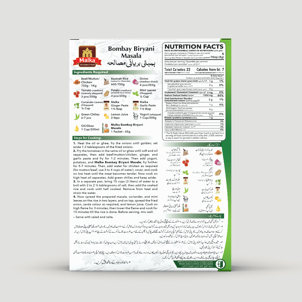 Adaugă un strop de autenticitate indiană în bucătăria ta cu Bombay Biriyani de la Malka. Acest amestec special de condimente a fost creat pentru a aduce în farfuria ta gustul inconfundabil al unui biryani perfect, cu arome intense și pline de caracter. Fie că gătești pentru familie sau pentru invitați, Bombay Biriyani transformă orice masă într-o adevărată experiență culinară.