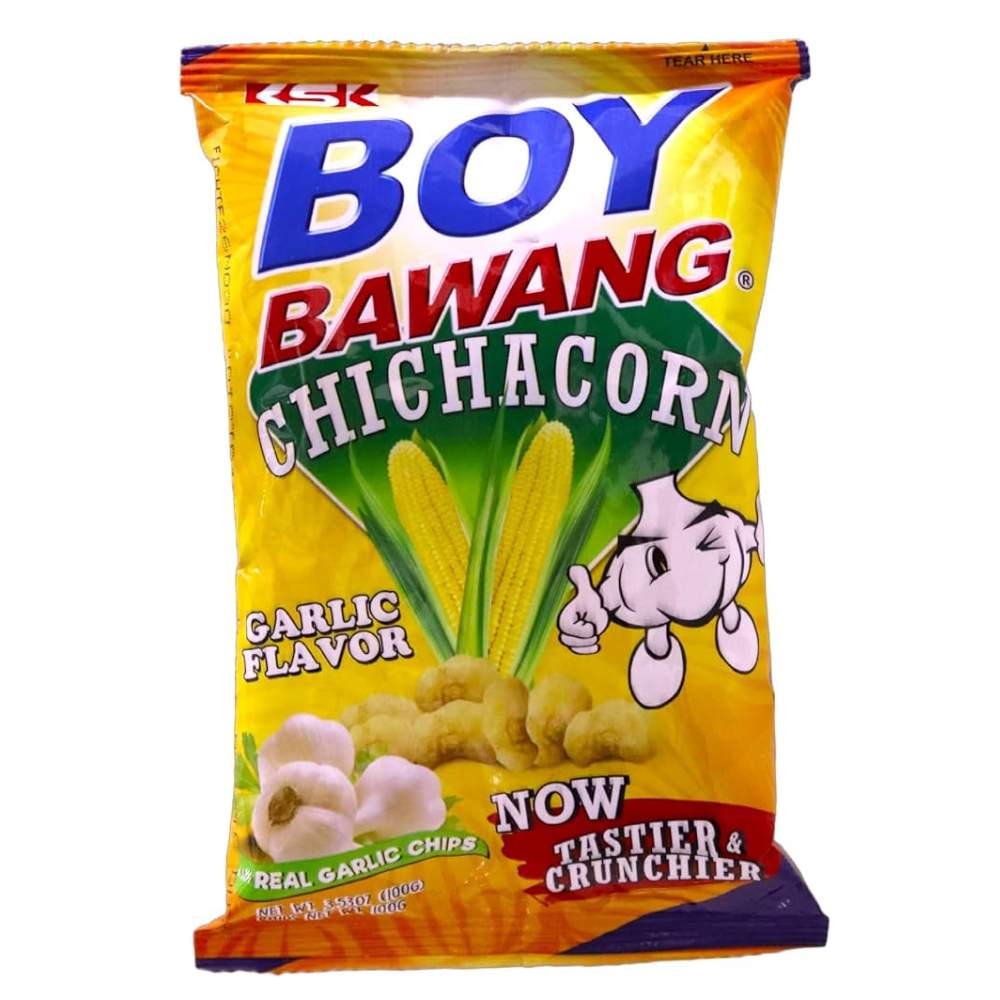 Boy Bawang Chichacorn este un snack filipinez popular, obținut din boabe de porumb expandat, prăjite și asezonate cu o aromă bogată de usturoi. Gustul intens și textura aerată îl fac extrem de plăcut și ușor de consumat, fiind o alegere excelentă pentru orice moment al zilei.