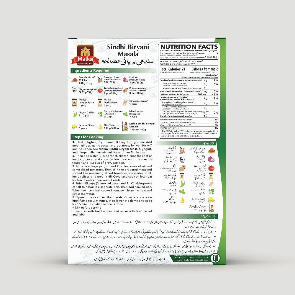 Sindhi Biriyani aduce în farfuria ta gustul inconfundabil al unei rețete tradiționale din India. Amestecul de condimente este perfect pentru a transforma orice preparat din orez sau carne într-o adevărată explozie de arome. Fiecare ingredient, de la chili până la coriandru, este ales cu grijă pentru a oferi o aromă intensă și echilibrată. Acest condiment nu doar că îmbogățește gustul preparatelor tale, dar le adaugă o complexitate deosebită, făcând fiecare masă să fie o experiență culinară autentică.